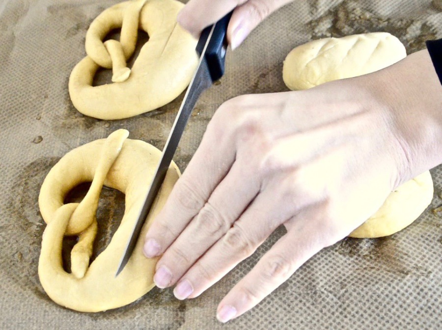 Den unteren, dickeren Teil der Brezel mit einem Messer einschneiden. Eventuell mit etwas Salz bestreuen.