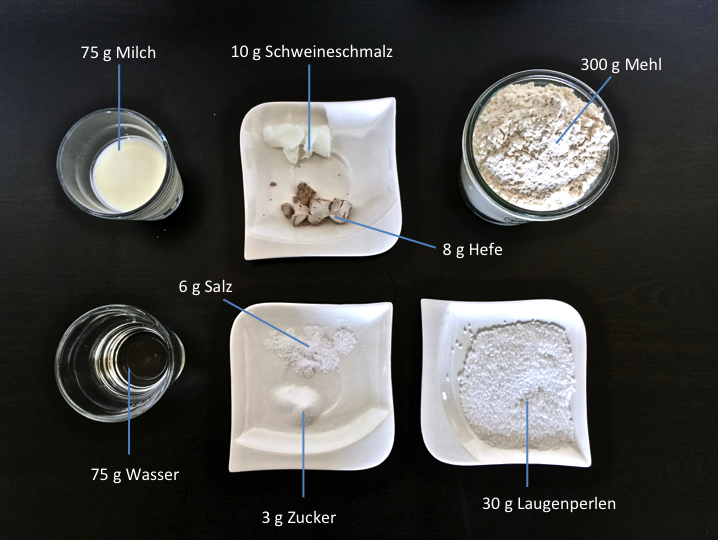 Ich nehme immer eine 3%-ige Laugenlösung, alles andere schmeckt mir dann schon zu intensiv. Hierfür nehme ich je 1000 g Wasser (entspricht in etwa 1 Liter) 30 g Laugenperlen. Damit die Brezeln