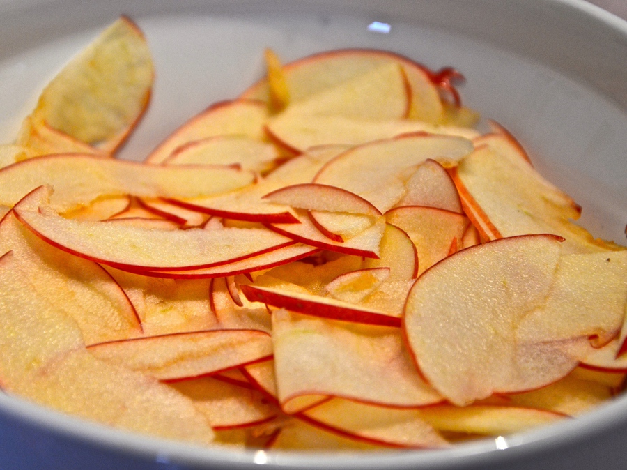 In der Zwischenzeit den Apfel schälen und in sehr dünne Scheiben schneiden. Die Apfelspalten zufügen und weitere 10 Minuten mitkochen. Zum Schluss mit Gewürzen nach Wahl