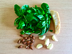 Wer keinen Mixer hat, kann das Pesto auch im Mörser zubereiten. Für eine Portion ohne Knoblauch nimmt man folgende Mengen: