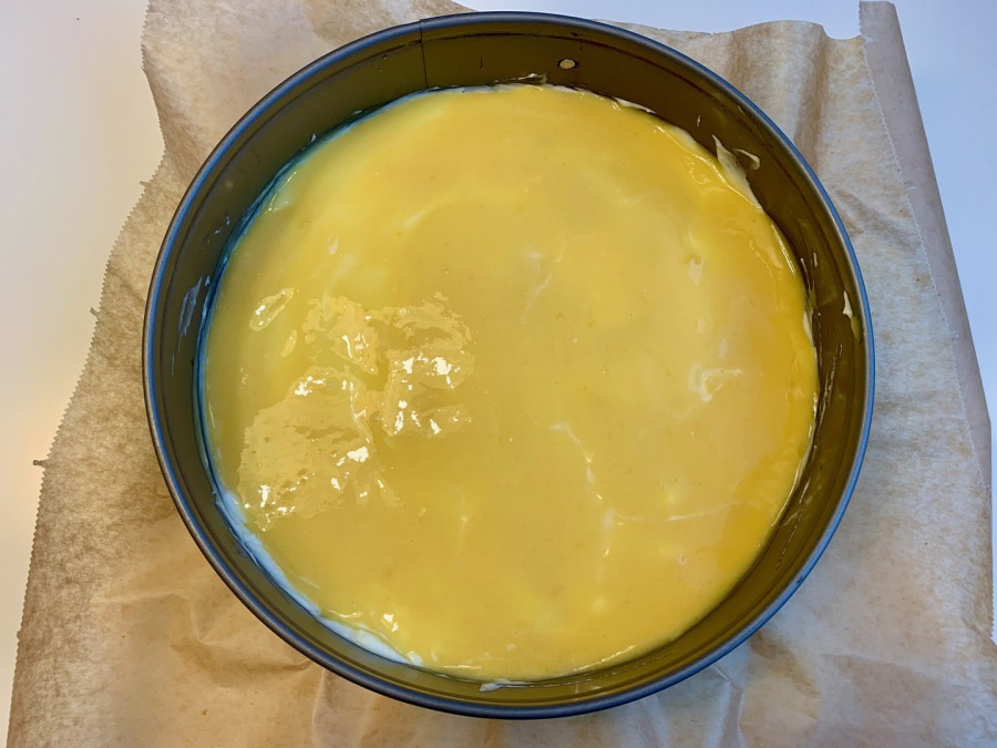 Zum Schluss das restliche Mangopüree gleichmäßig auf der Vanillecreme verteilen.